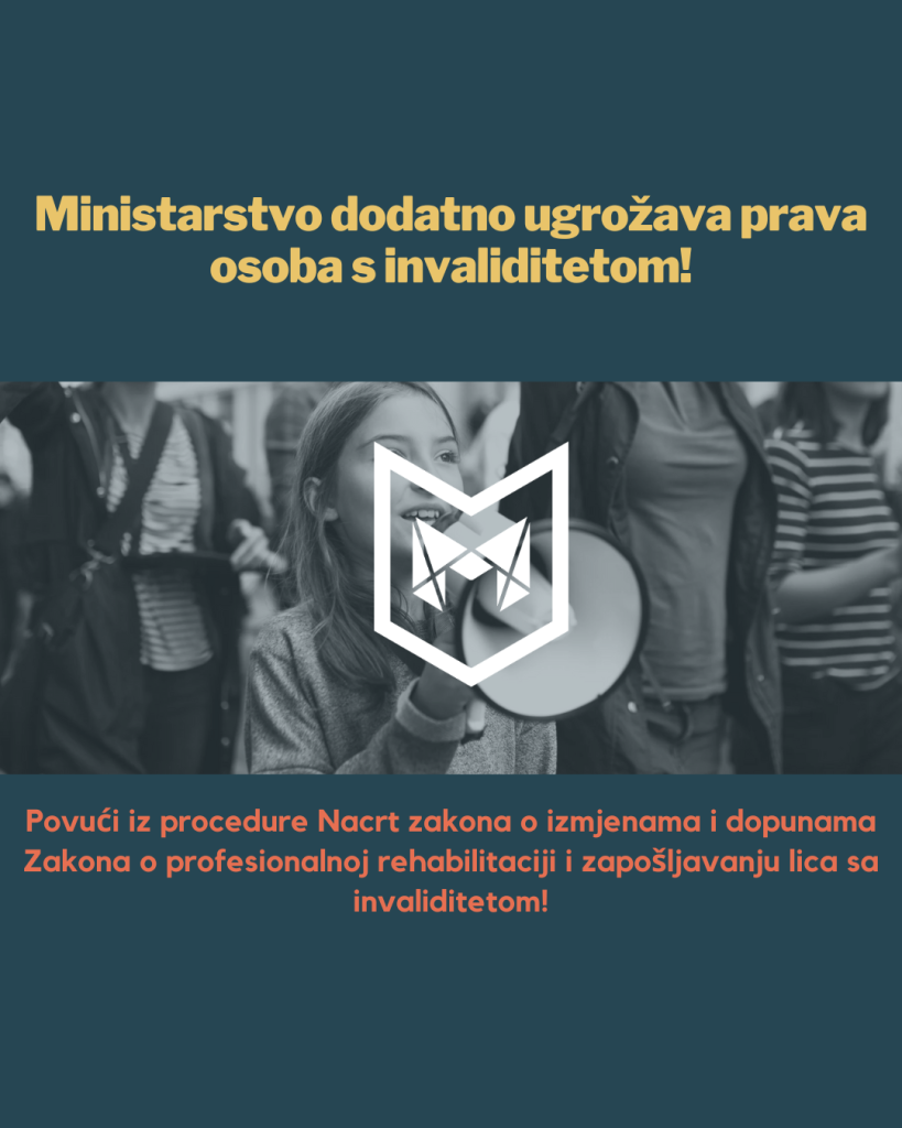 Javna rasprava o Nacrtu zakona o izmjenama i dopunama Zakona o profesionalnoj rehabilitaciji i zapošljavanju lica sa invaliditetom završena je 5. marta, nakon što je Ministarstvo rada, zapošljavanja i socijalnog dijaloga prethodno odbilo da je obustavi i Nacrt zakona povuće iz procedure, uprkos činjenici da se ovakav Nacrt ne može popraviti. Njegova jedina svrha je […]
